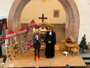 Im Mittelpunkt standen Franzi und Theodor, die zu Hause im Wohnzimmer die Porzellanfiguren für ihre Krippe aus einem Karton auspackten. Mit jeder vorsichtig herausgenommenen Figur geschah etwas Besonderes: Die Krippenfiguren erwachten zum Leben. Parallel dazu betrat jeweils das Kind, das die entsprechende Rolle spielte, die Bühne und ließ die Geschichte um die Geburt Jesu Schritt für Schritt lebendig werden.