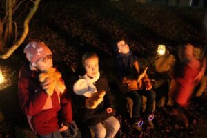 In der Kita angekommen, erhielten alle Kinder einen Weckmann zum Teilen – ganz im Sinne der St. Martins Tradition. Die Weckmänner wurden bereits am Morgen gemeinsam mit Eltern und Großeltern in der Kita gebacken. Im Garten ließen wir den Abend bei warmen Lichtschein und an der Feuerschale, die von der Feuerwehr betreut wurde, ausklingen. Gut gestärkt mit Würstchen im Brötchen und Getränken machten sich die Familien nach netten Gesprächen zufrieden und glücklich auf den Heimweg und sicher träumten einige Kinder in dieser Nacht von ihrer Begegnung mit St. Martin.