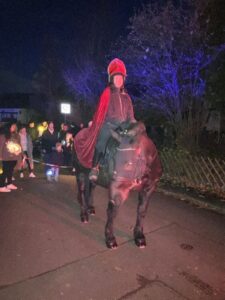 Im Anschluss machten wir uns begleitet und abgesichert von der Freiwilligen Feuerwehr Ronshausen, auf den Weg zur Kita. Die Kinderaugen leuchteten, als sie St. Martin hoch zu Ross endeckten, der uns bei unserem Laternenumzug begleitete.