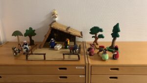 Eine Krippe zum Spielen In der ev. Kita Eulenhaus gibt es in dieser Vorweihnachtszeit etwas Neues: Im Flur des Haupthauses steht eine Krippe mit Krippenfiguren, die bespielt werden dürfen. Die Personen und Tiere wurden von einer Gönnerin des Eulenhauses in Handarbeit gehäkelt und liebevoll gefertigt. Alle Figuren sind weich und für kleine Hände gemacht. Durch